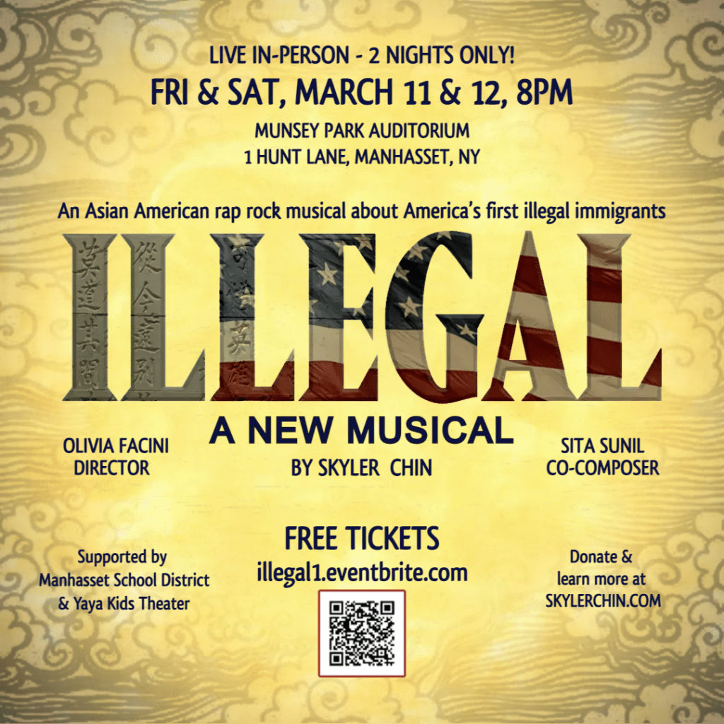 Join us on March 11 & 12 at 8pm for free, live and in-person concert performances of ILLEGAL in Manhasset, Long Island. With a professional AAPI New York cast, colorful characters, rap, song, comedy and drama, ILLEGAL entertains as it shines a light on a dark chapter in history and on the fighting spirit of those who dared to become American. This production is supported by the Manhasset School District and Yaya Kids Theater. Location: Munsey Park Auditorium, 1 Hunt Lane, Manhasset, NY.
