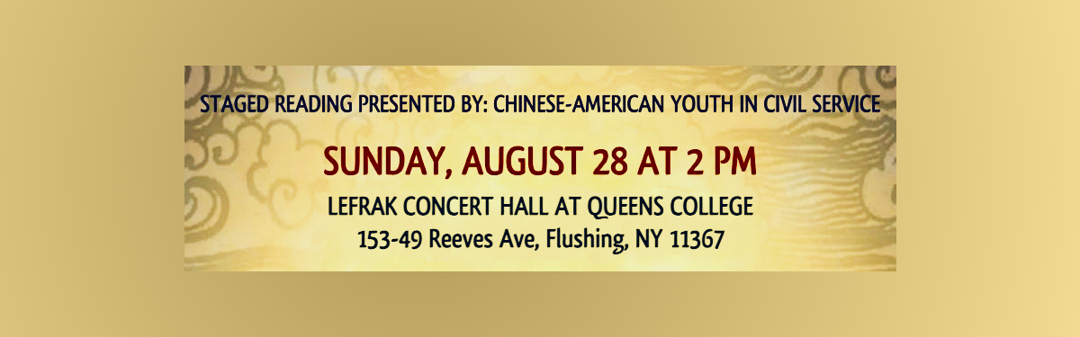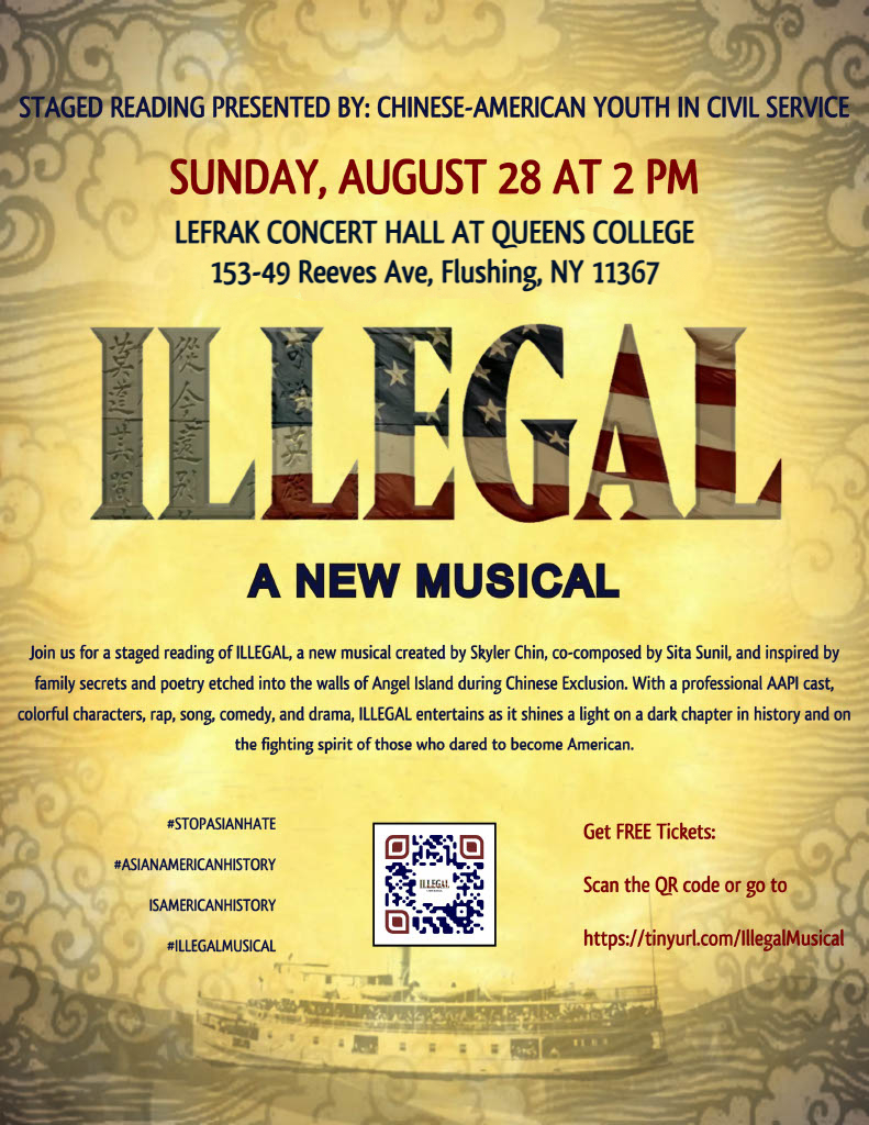 We are thrilled to announce a staged reading of ILLEGAL in Queens on August 28th! Admission is free, thanks to our sponsors, Chinese American Youth in Civil Services. Please join us and spread the word: